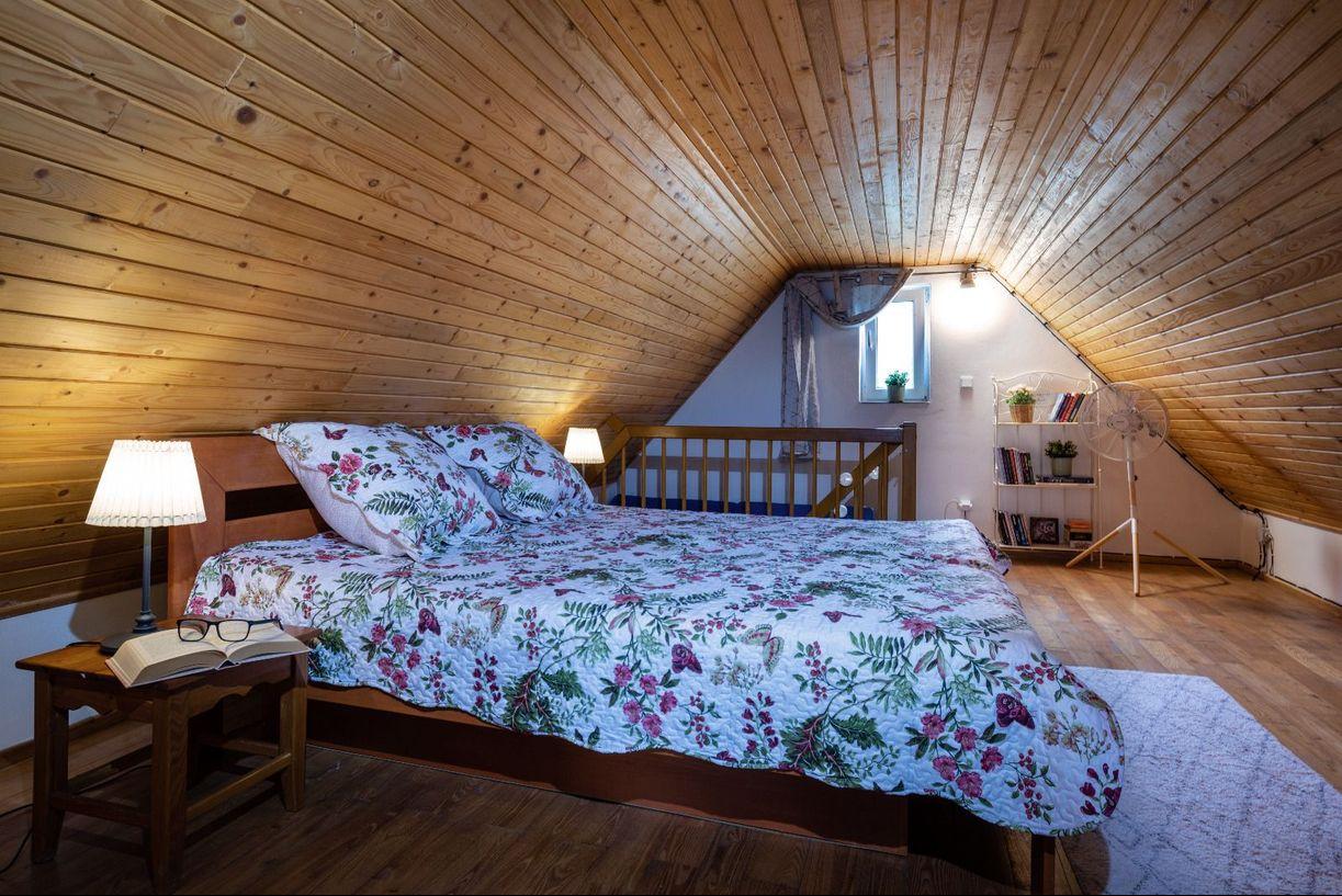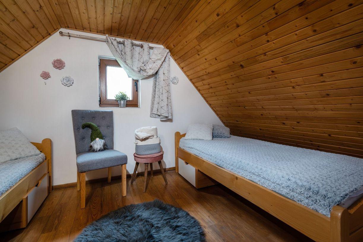 na poschodí - spálňa s manželskou posteľou a izba s dvomi samostatnými posteľami.