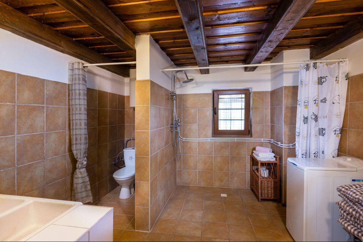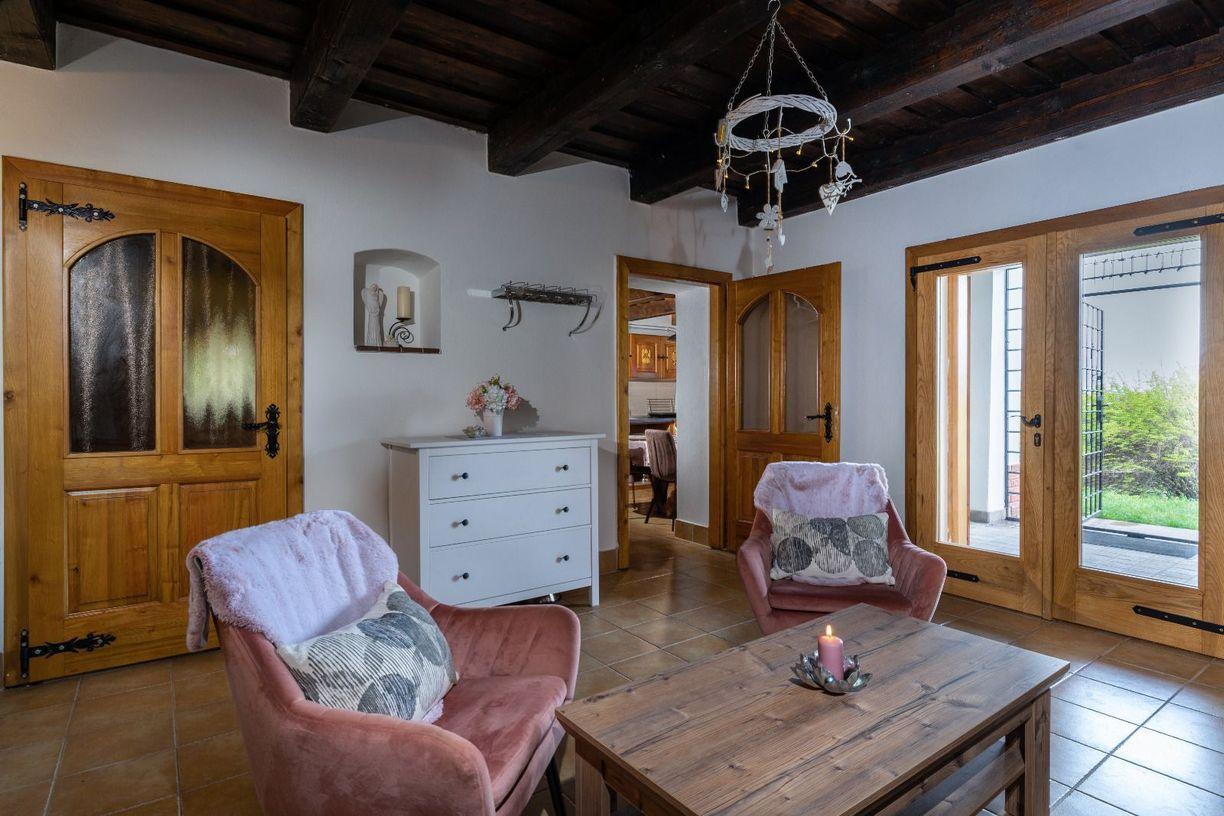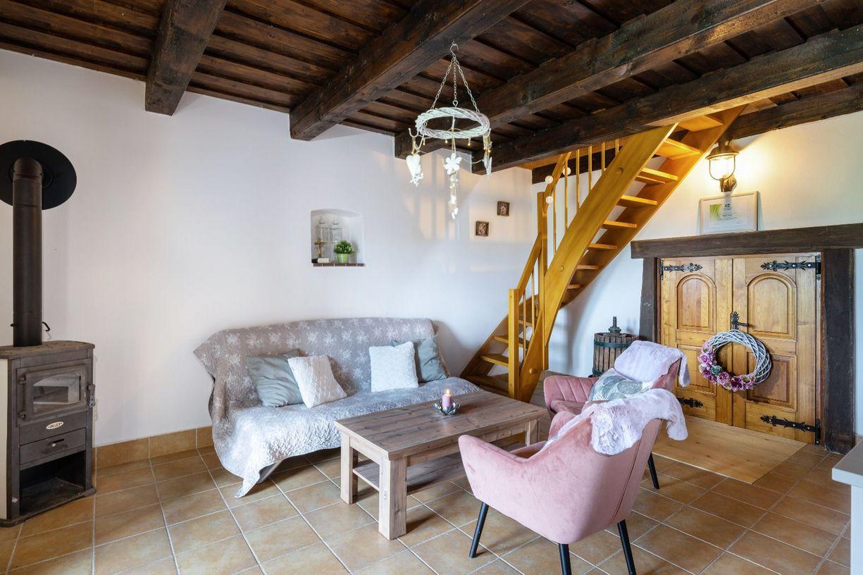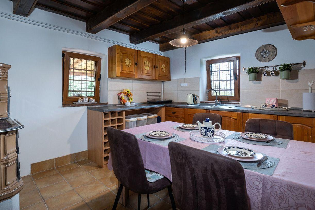 Hlavná miestnosť- obývacia izba je štýlovo zariadená, kde teplo domova vám vytvoria kachle, ktoré sa tu nachádzajú. Rovnako štýlovo a funkčne je zariadená aj kuchyňa, kde sa nachádza aj krásna keramická pec.